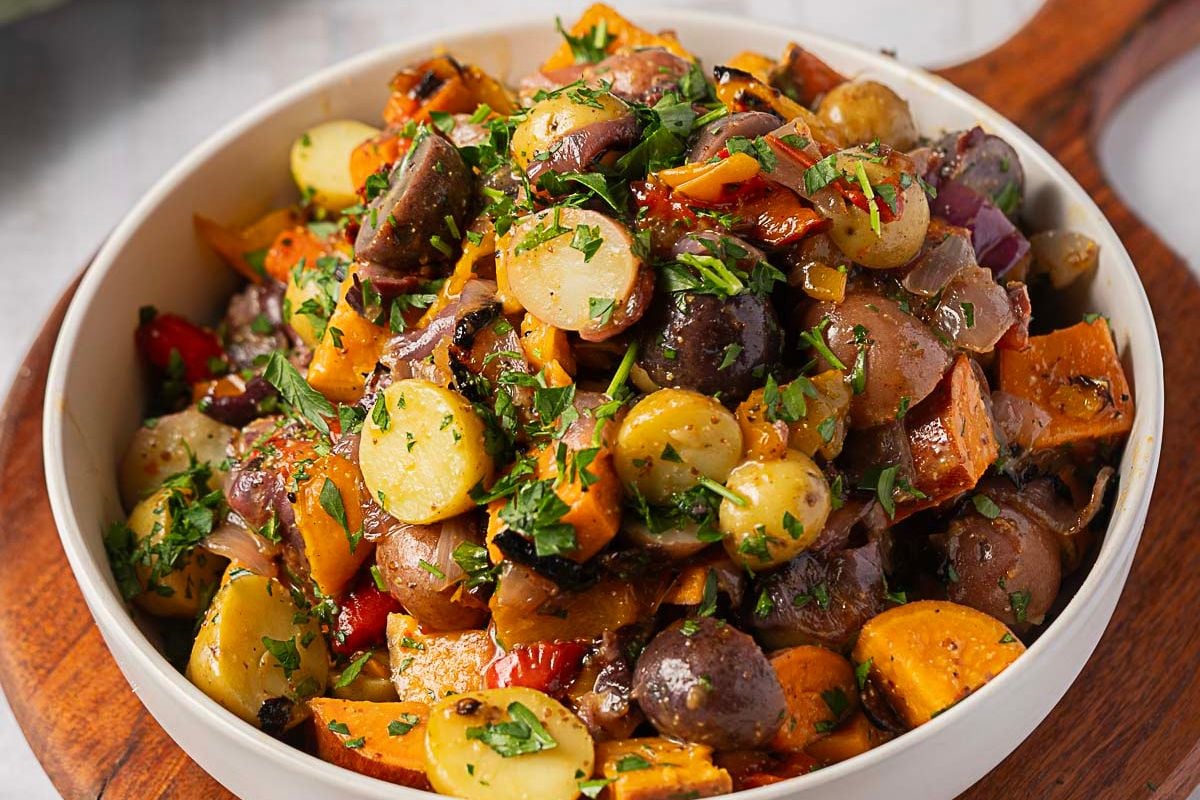 A rainbow potato salad with a mix of potatoes, including sweet potatoes and purple potatoes. Topped with olives and a honey mustard dressing.