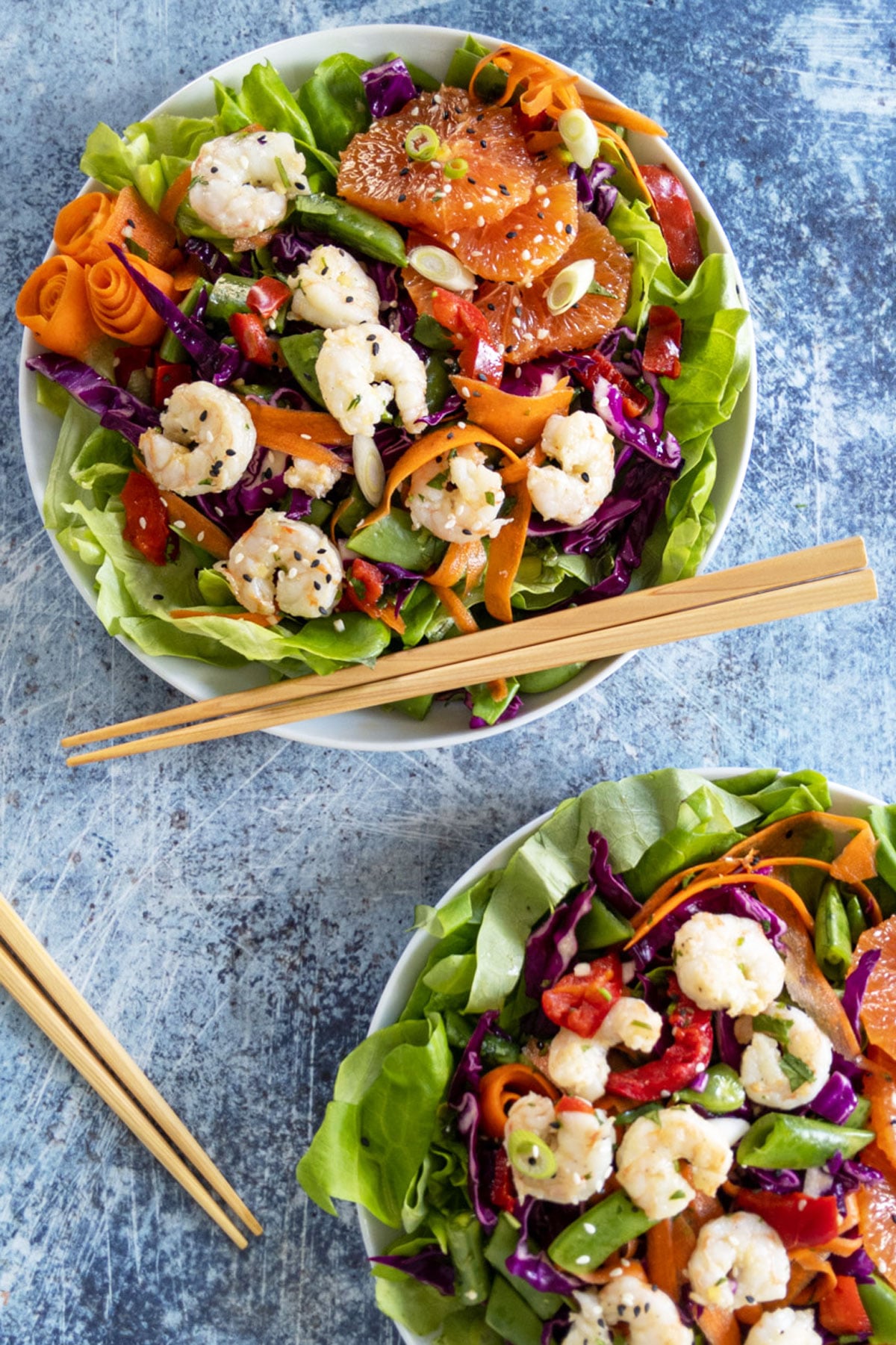 This simple no-cook Asian-inspired shrimp salad is full of flavor and comes together in just minutes. It uses frozen shrimp, loads of veggies, fresh citrus, and a citrus sesame dressing to pack a flavorful punch without a lot of work.