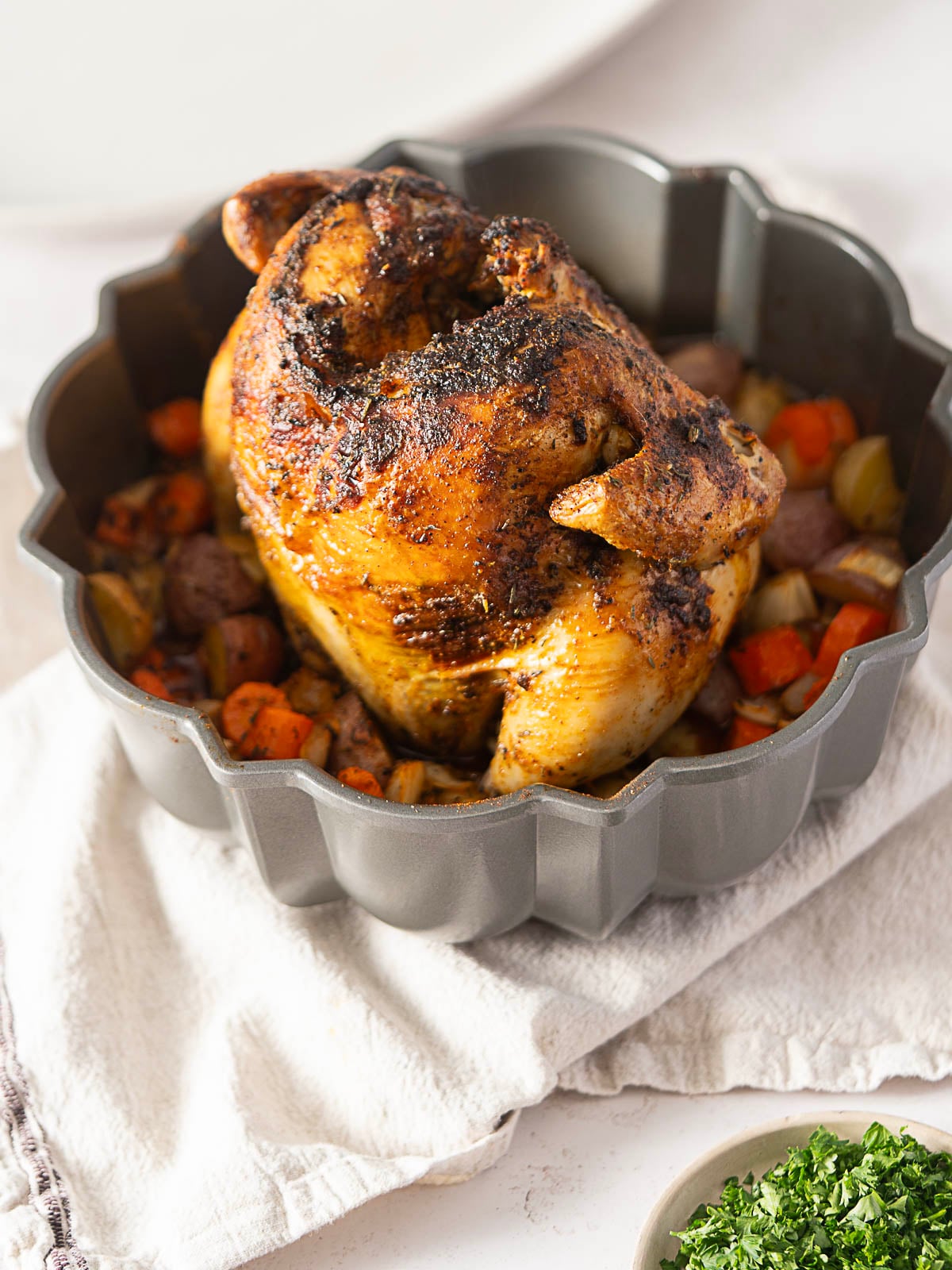 Did you know you can make a rotisserie chicken at home using a bundt pan and your oven? You may never make a roast chicken the same way again. My bundt pan chicken recipe is loaded with veggies and finishes with a 2-minute pan sauce, so no flavor is left behind.