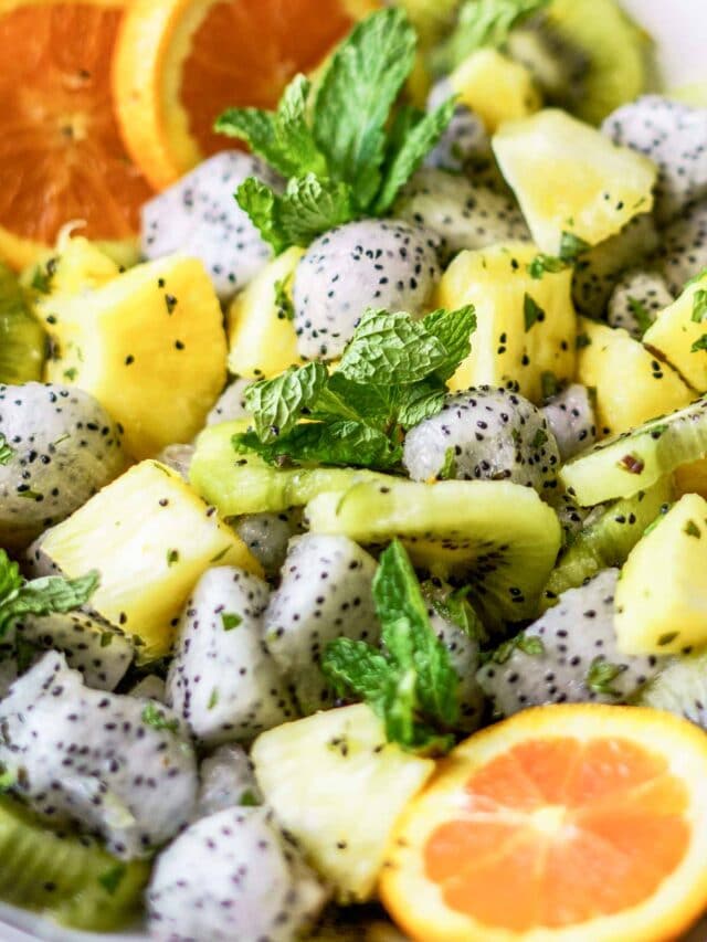 This dragon fruit salad is full of tropical flavors and colorful fruits. Use white or pink dragon fruit for this easy fruit salad topped with a citrus and mint dressing. This refreshing side is perfect for your next brunch.