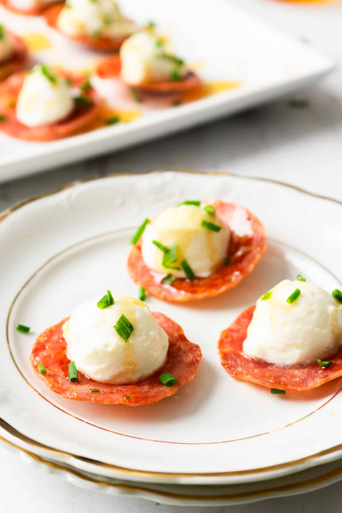 - Place the salami crisps on your serving platter. Top with a dollap of whipped ricotta cheese. Mix the hot sauce and honey and drizzle over the honey. Sprinkle with chives.¼ cup honey, 2 teaspoons hot sauce, 2 Tablespoons minced fresh chives