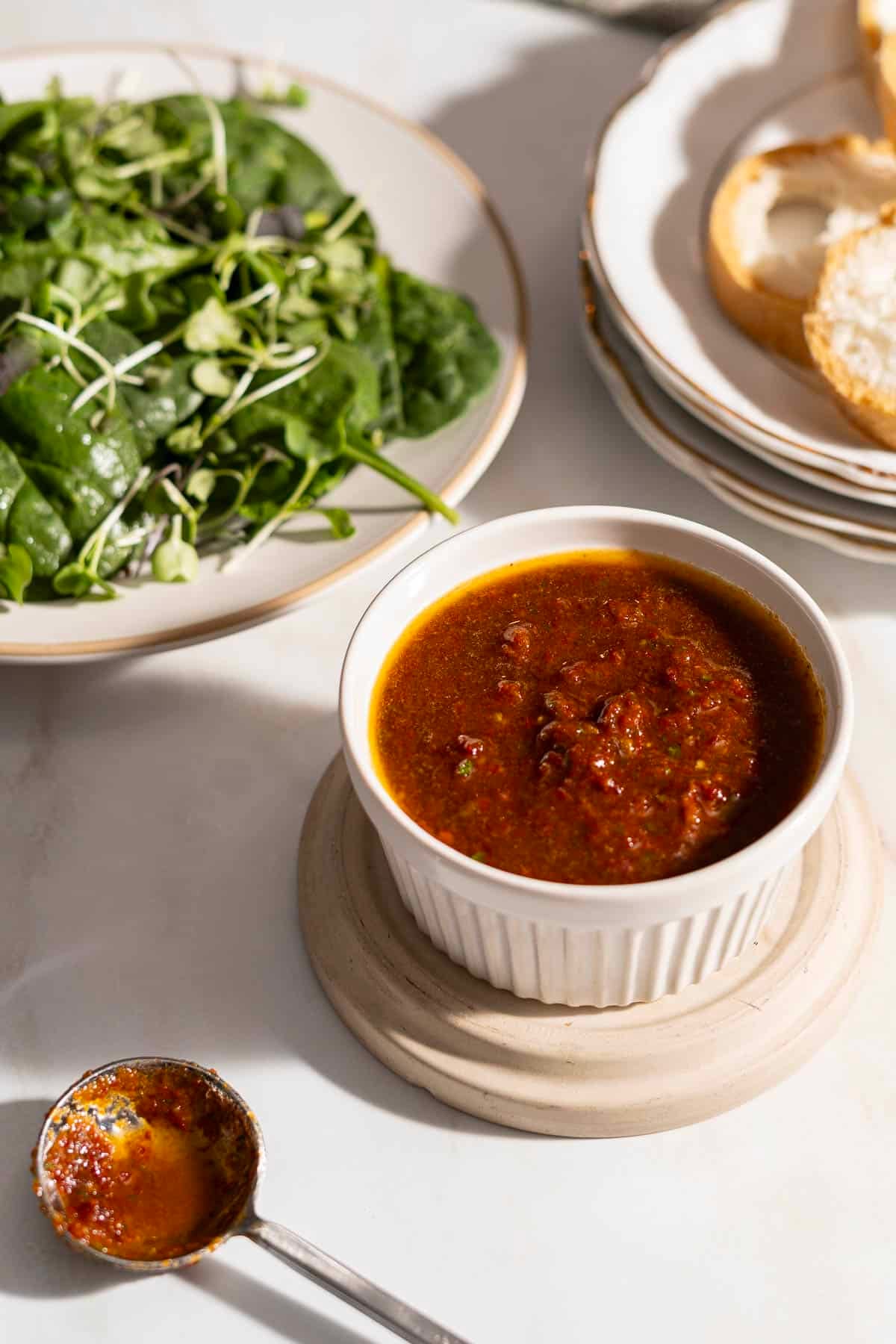 This sun-dried tomato vinaigrette is as simple as it gets! Rich, tangy sun-dried tomatoes come together with red wine vinegar and olive oil to create a flavor-packed sauce that's perfect for drizzling over fresh green salads or as a dipping sauce for appetizers.