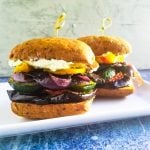 Spread the cream cheese evenly on the top and bottom of each roll. Add a round of eggplant on the bottom of each roll. Top with pesto. Repeat with each vegetable layering on the pesto then top with bun. A long toothpick can be helpful for keeping the sandwiches together.